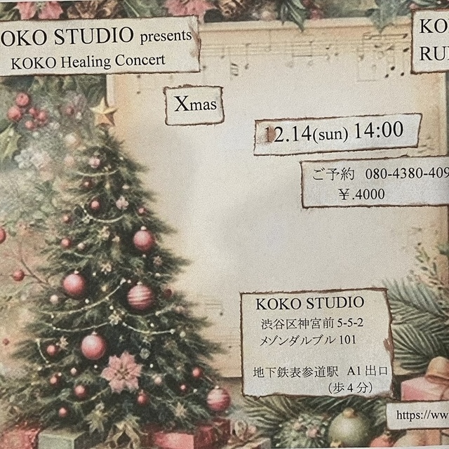 お知らせ クリスマスコンサート 12月14日(日)14:00KOKO STUDIO クリスマスコンサートです♪様々なクリスマスソングをお楽しみください!終わる頃には表参道のイルミネーションも点灯しています!iPhoneから送信